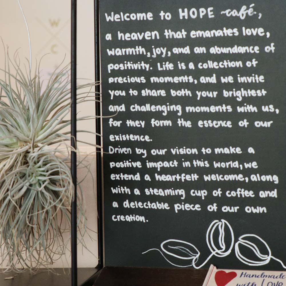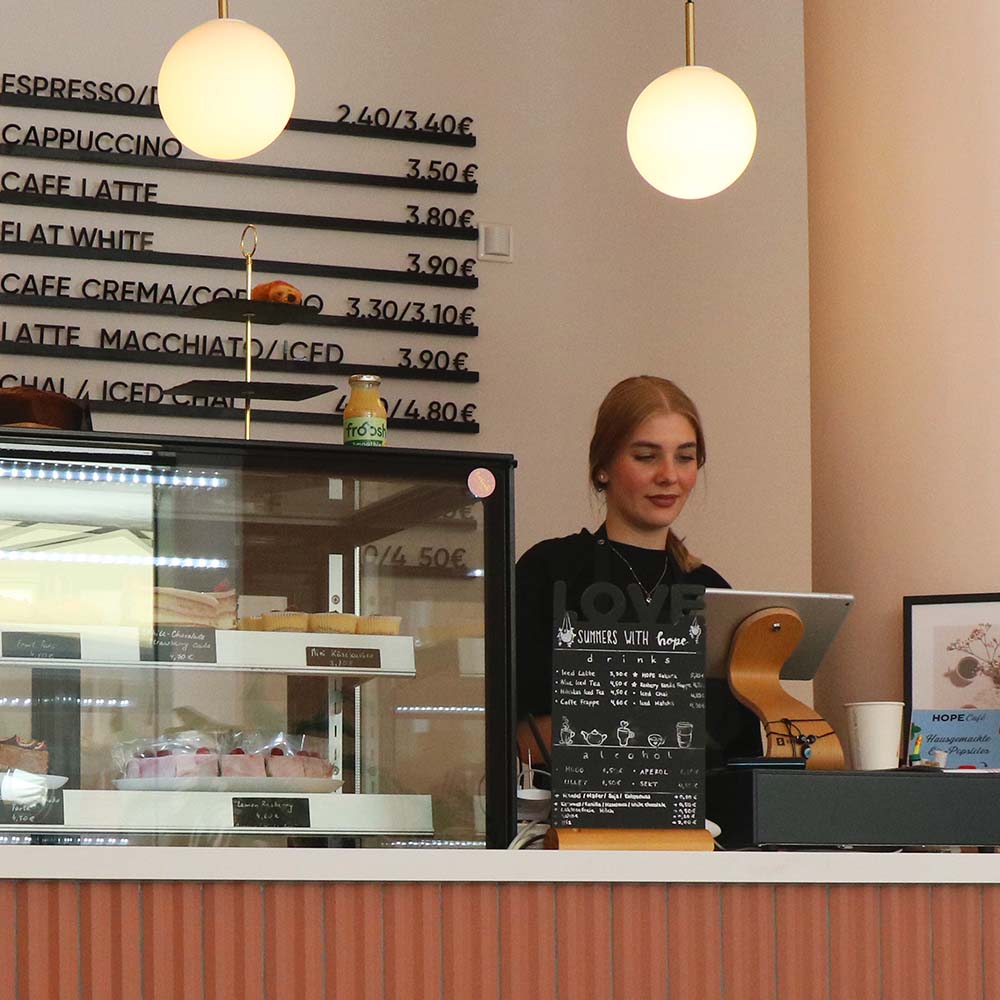 Das Hope steht zu seinem Namen. Es ist ein Ort der Hoffnung. Sanft und freundlich empfängt es seine Besucher mit Details, die von Herzen kommen und die Körper, Geist und Seele nähren. Die kunstvollen Kuchen und Torten aus der eigenen Konditorei verführen dazu, die Tasse Specialty Coffee in süßer Gesellschaft zu trinken und in die weichen Atmosphäre des Ladens einzutauchen, um bei sich anzukommen.
